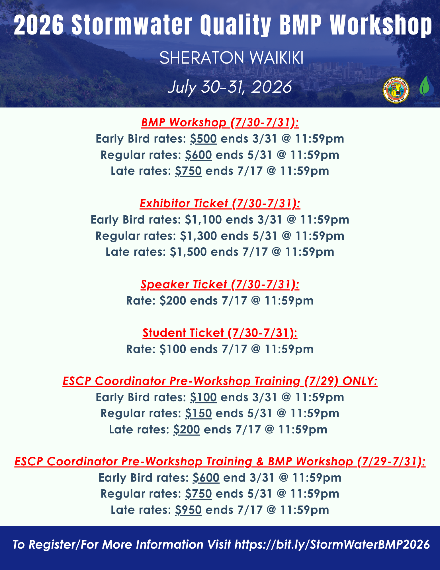 The Stormwater Quality Best Management Practices (BMPs) workshop is an in-person, two-day educational event hosted by the City and County of Honolulu’s Storm Water Quality Division. This year the workshop will be on July 30th and July 31st at the Sheraton Waikiki. The workshop brings together professionals from across Hawaiʻi to share practical strategies, lessons learned, and innovative approaches for protecting water quality and managing stormwater sustainably.